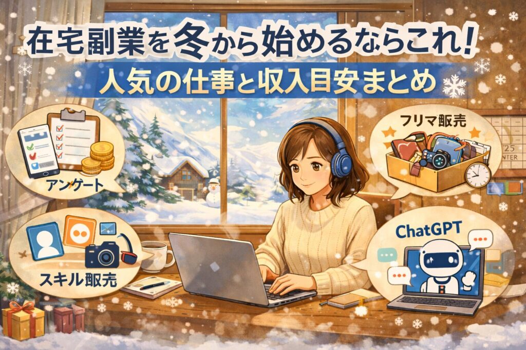 はじめに 年末に向けて慌ただしさが増す一方で、寒さや天候の影響から外出を控える人が多くなる冬。そんな季節こそ、在宅で副収入を得る絶好のチャンスです。「収入を増やしたい」「年末年始の出費をカバーしたい」「将来のために副業を始めたい」——そう考... -