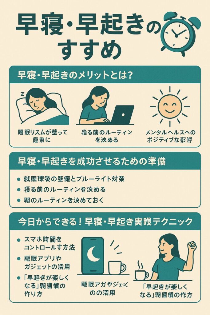 この記事では、早寝・早起きのメリットから、明日からすぐに試せる実践法まで、わかりやすくご紹介します。