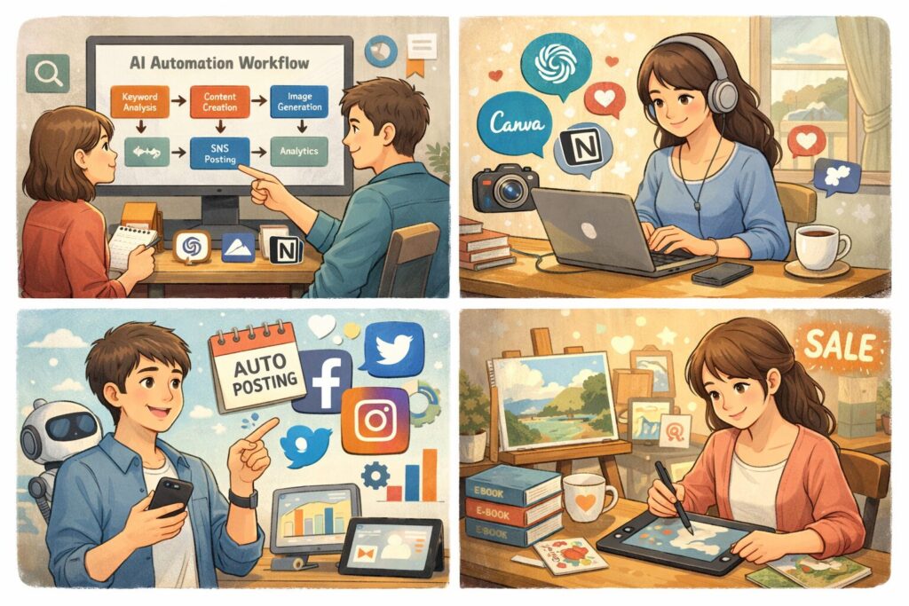 特にブログやコンテンツビジネスでは、AIツールを組み合わせることで制作・集客・販売までの一連の流れを効率化できます。ここでは、AIツールを活用した副業自動化の代表的な仕組みを紹介します。