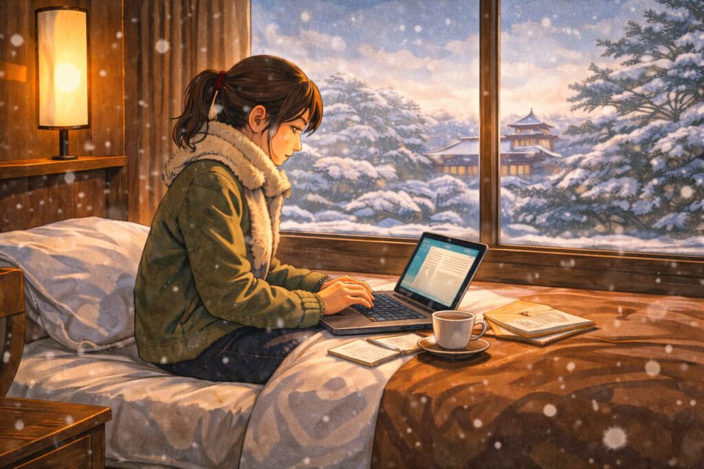雪化粧をまとった古都の風景の中で、ノートパソコンを広げて仕事をする体験は、都会では味わえない深い静けさと豊かな時間をもたらしてくれます。
