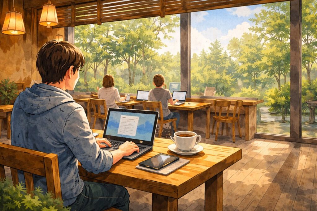 カフェ選びでは「Wi-Fiの安定性」「電源の有無」「混雑度」を事前にチェックしましょう。午前中など比較的空いている時間帯を狙うのもおすすめです。